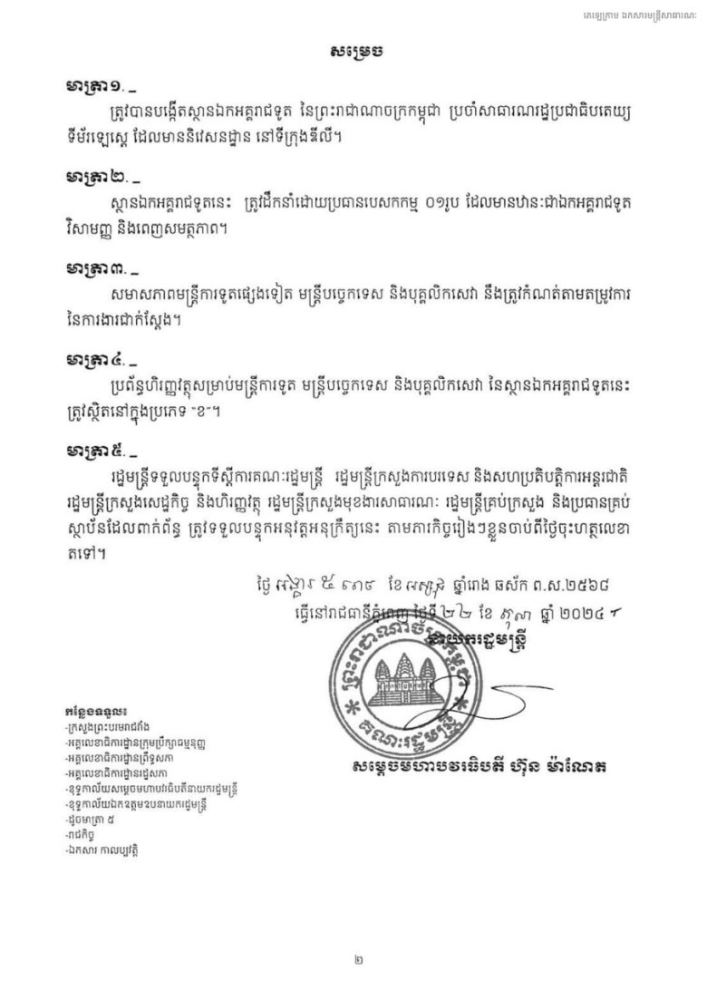 ភ្នំពេញ៖ រាជរដ្ឋាភិបាលកម្ពុជា បានចេញអនុក្រឹត្យដោយសម្រេចបង្កើតស្ថានឯកអគ្គរាជទូតកម្ពុជា ប្រចាំសាធារណរដ្ឋប្រជាធិបតេយ្យទីម័រឡេស្ដេ ដែលមាននិវេសនដ្ឋាន នៅទីក្រុងឌីលី។ ក្នុងអនុក្រឹត្យដែលសម្តេចធិបតី ហ៊ុន ម៉ាណែត ចុះហត្ថលេខានៅថ្ងៃទី២២ ខែតុលា ឆ្នាំ២០២៤នេះ បានឱ្យដឹងថា ស្ថានឯកអគ្គរាជទូតនេះ ត្រូវដឹកនាំដោយប្រធានបេសកកម្ម ០១រូប ដែលមានឋានៈជាឯកអគ្គរាជទូតវិសាមញ្ញ និងពេញសមត្ថភាព។